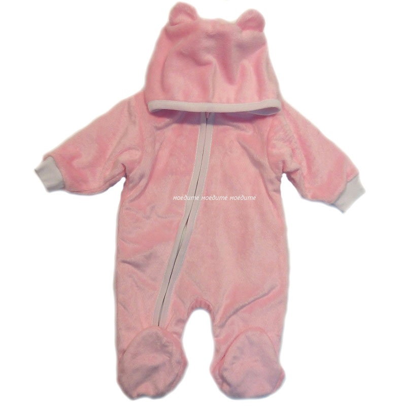 Комбинезон с капюшоном декорированный ушками, с закрытыми ножками, рукавчики на манжетиках, спереди на молнии до конца одной ножки.