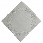 Пододеяльник выполнен из белой бязи с отделкой рюшей цвета шампань. Размер 120*120 см. Одеяло заправляется сверху.